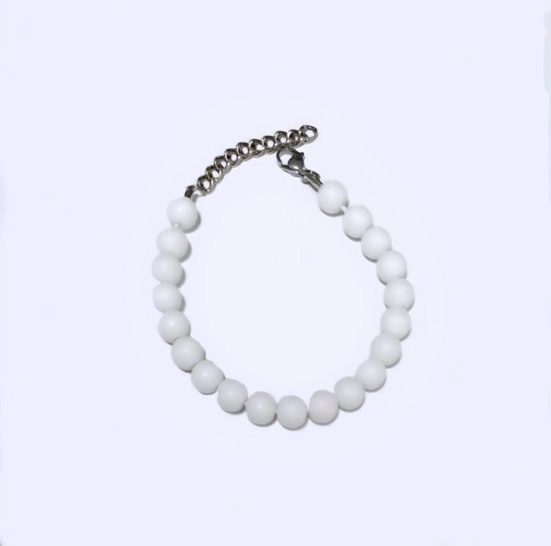 Ein mattweißes Perlenarmband aus hochwertigen Acrylperlen mit verstellbarem Edelstahl verschluss.